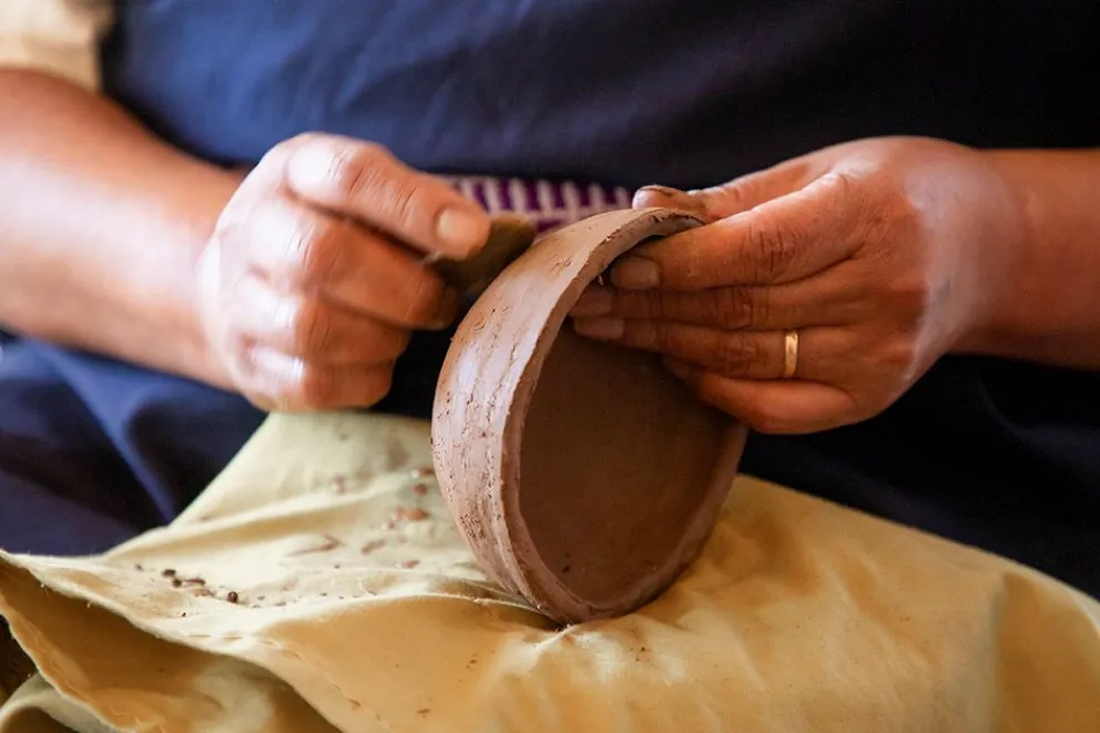 Luego comienza un largo proceso de limpieza y preparación del material. Las piezas se moldean a mano, utilizando técnicas de pellizco o rollos de arcilla, y más tarde se alisan y bruñen para impermeabilizarlas, sin necesidad de esmaltes. La cocción se realiza a leña, en hornos construidos en la propia comunidad con la participación de familias, docentes y estudiantes.